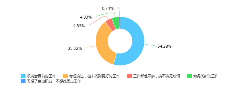 在问及未更换工作的原因时,54%的人选择“很满意目前的工作”,35%的人考虑过更换,但没有找到更好的工作。说明还比较满意当前的工作。