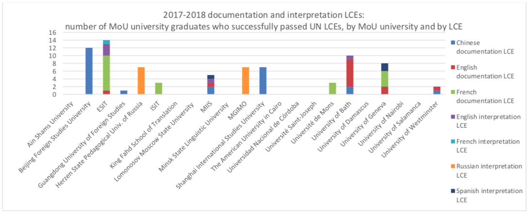 联合国大会和会议服务部与全世界22个高校(包括国内3所)签订合作备忘录,为联合国培养6种官方语文的语言服务人才,包括口笔译人才、编辑出版人才、逐字记录和简要记录人才。北京外国语大学作为联合国译训班的后继机构,于2008年成为国内首个签约机构。