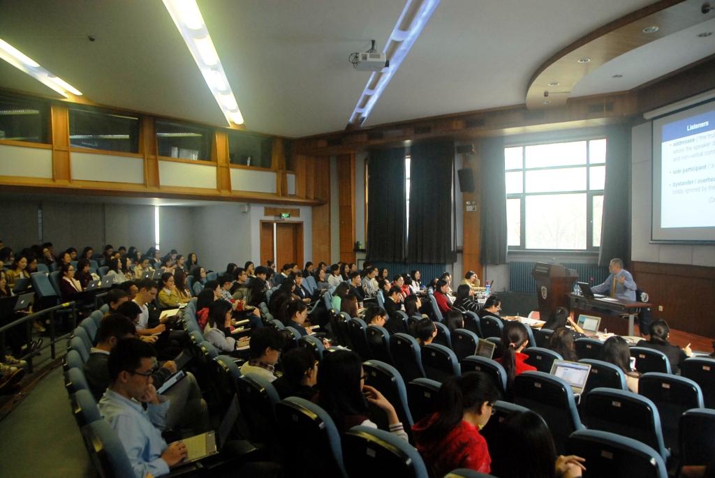 他于19日当天分别做了两场精彩的讲座。第一场主要是高翻学院的学生参加,由周明老师主持,主题是口译过程的全景介绍。Maurizio Viezzi教授从口译定义、口译中各参与方的角色、口译过程、译员角色、口译质量评估等几方面向大家深入浅出地介绍,让师生获益颇丰。