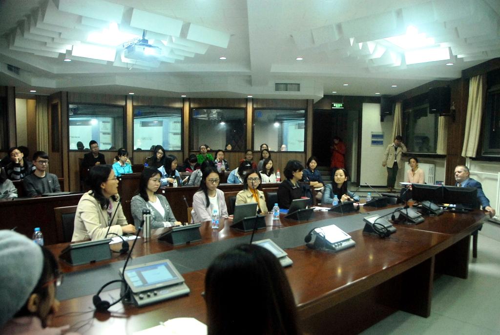 第二场主要是高翻学院、其他学院和学校的老师和博士生参加,由梁颖老师主持,主题是30年来口译的变迁。Maurizio Viezzi教授从70年代到现在的口译界的变迁入手,和大家探讨当今国际口译界、口译研究、口译教学的8个关键词,以及这种时代变迁对学生和口译工作者的意义。