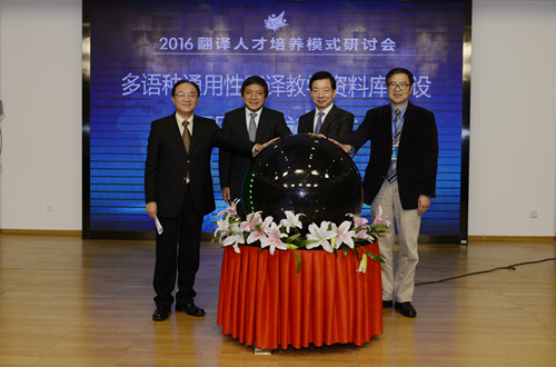 致辞环节结束后,会议举行了多语种翻译教学资料库建设项目发布仪式。周明伟、王刚毅、鲍川运、彭龙共同按下启动按钮,标志着多语种翻译教学资料库正式上线并投入使用。