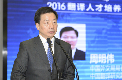 周明伟在致辞中高度评价了北外在翻译人才培养方面的成就,对北外在中国对外交往中发挥的积极作用给予了肯定。他表示,当前中国正在走向世界舞台的中心,中国在国际社会的影响力体现在各个方面,中国在国际事务上的话语权日益增加,这就对我们现有的翻译人才培养模式提出了新的挑战,带来了新的机遇。我们要构建融通中外的话语体系,探索和建立新的翻译人才培养模式,不仅要培养一流的实用型翻译人才,更要在翻译学科理论方面进行研究,探索翻译学科的发展规律,为中国走出去和参与世界治理贡献力量。