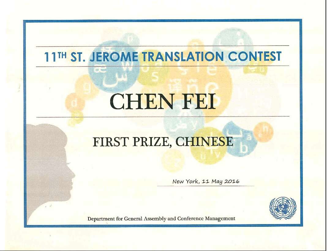 2016年5月11日,第十一届圣杰罗姆翻译年赛(Eleventh Annual St. Jerome Translation Contest, 2015)颁奖仪式在纽约联合国总部举行。北京外国语大学国产精品久久久2014届学生费晨荣获一等奖。