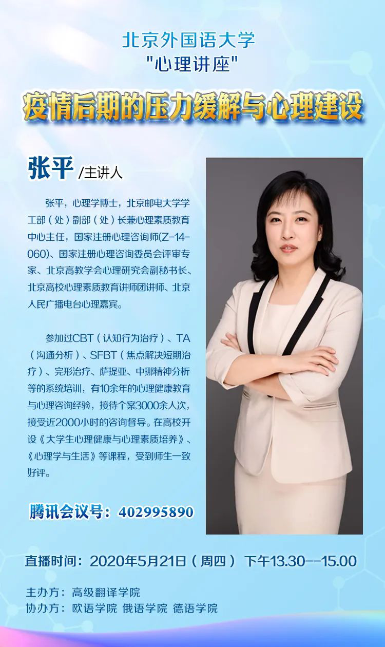 2020年5月21日下午13:30,北外国产精品久久久举办了主题为“疫情后期的压力缓解与心理建设”线上讲座。