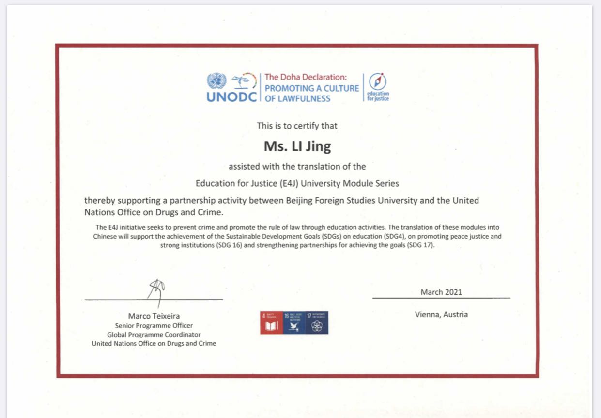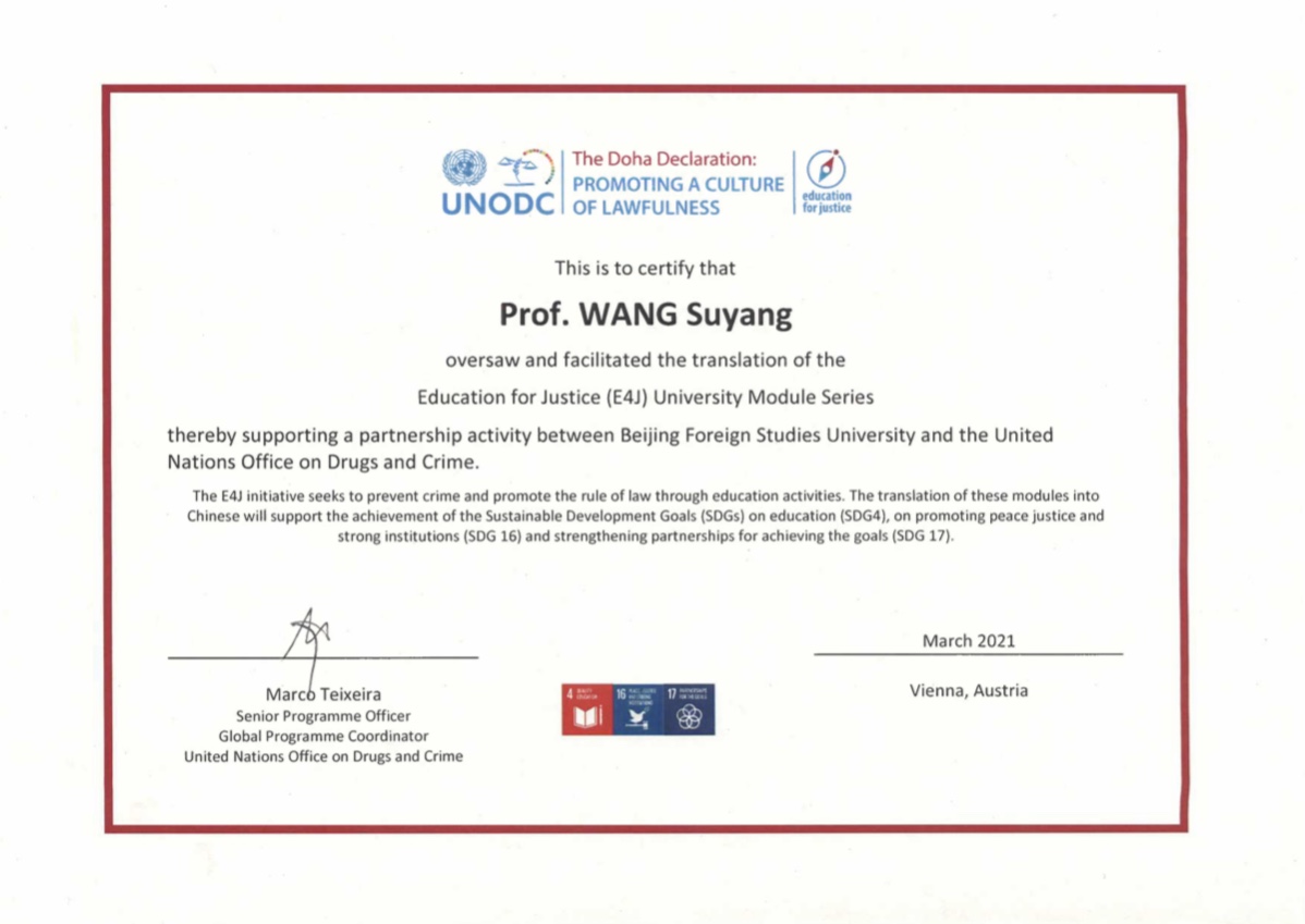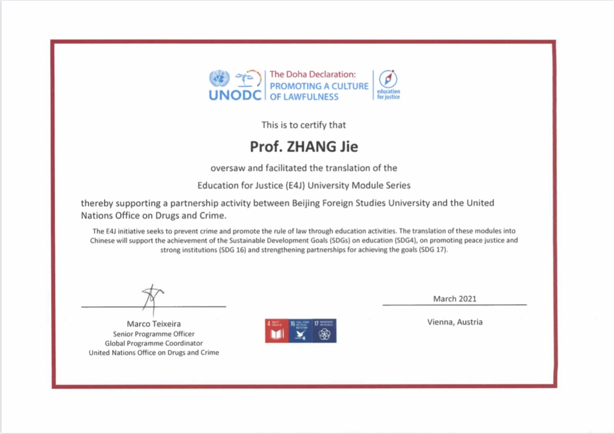 2021年4月8日下午,联合国毒品和犯罪问题办公室(UNODC)举行线上表彰会,表彰我院和法学院师生在其“教育促进正义”(E4J)项目中做出的突出贡献。