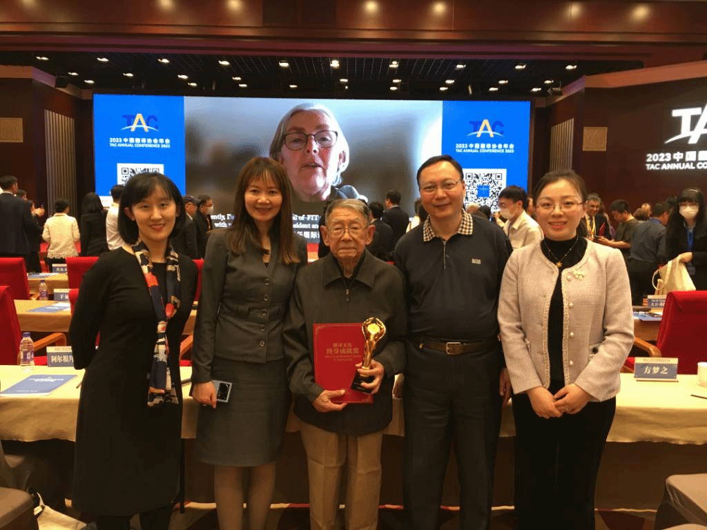 庄绎传教授荣获中国翻译协会设立的表彰翻译家个人的最高荣誉奖项“翻译文化终身成就奖”,并登台领奖。
