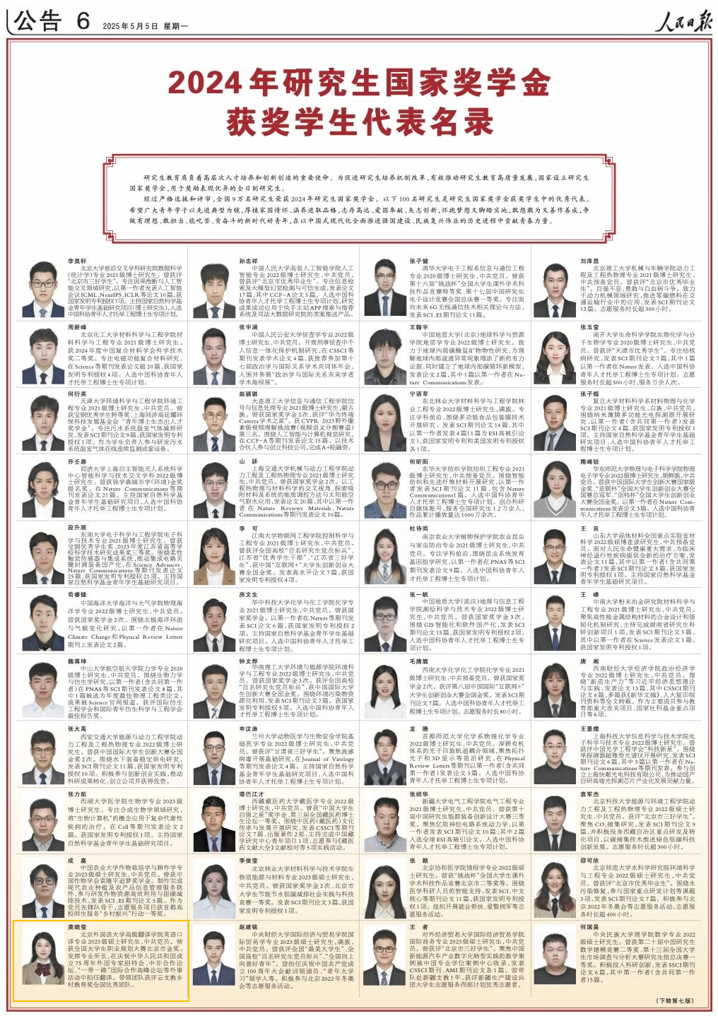 5月5日,北京外国语大学国产精品久久久英语口译专业2023级硕士研究生莫晓莹,获登《人民日报》2023-2024学年度研究生国家奖学金获奖学生代表名录。