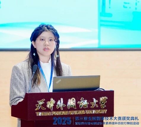 在这场高水平赛事中,我院2025级中英会议口译专业7班肖薇同学表现出色,荣获译后编辑赛道全国一等奖,并作为获奖代表在颁奖典礼上发言,展现了我院学子卓越的专业素养与技术应用能力。在发言中,肖薇分享了对人机协同翻译模式的体会。她表示,现代译者需兼具语言艺术家的细腻与技术专家的敏锐,不仅要打磨文字,也需善用工具。她认为,保持终身学习的能力、培养“语言+专业+技术”的复合素养,是应对技术革新的关键。
