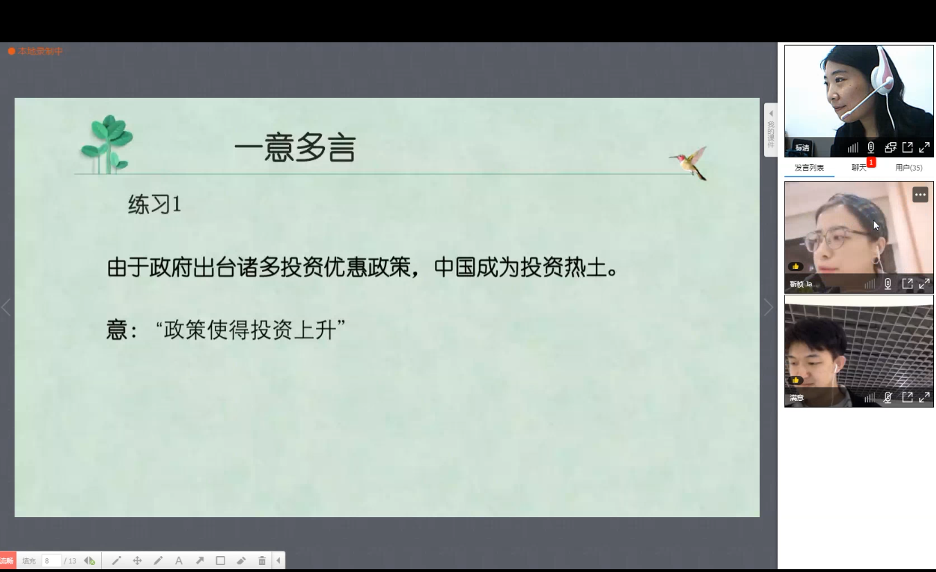 全国各地近50名学生通过台式电脑、笔记本电脑甚至手机参加和旁听了网络翻译培训的首次课程--中英交传课。他们体验到了和在国产精品久久久教室里一样的学习体验,直接面对老师和同学们,提问、回答、训练、点评。一堂课下来收获满满,还有作业需要课下完成。